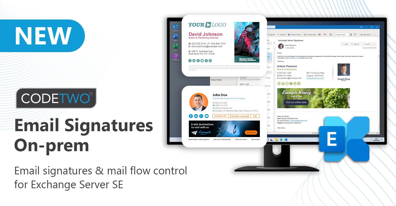 CodeTwo Email Signatures On-prem 正式发布!这款新产品可让您集中管理电子邮件签名和免责声明、创建自定义自动回复,并控制 Exchange 组织中的邮件流,无论您使用何种电子邮件应用程序。它是目前唯一一款完全支持 Exchange Server 订阅版(SE)的本地部署电子邮件签名解决方案。