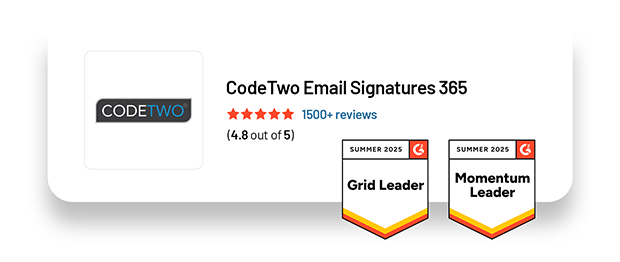 这绝对是值得我们炫耀的成就——在 G2 这一热门评论平台的电子邮件签名软件类别中,除了 CodeTwo Email Signatures 365 之外,没有其他解决方案能获得如此多的评论。凭借 4.8 分(满分 5 分)的评分,我们证明自己是 G2 用户寻找可靠且易于使用的电子邮件签名管理解决方案时的最佳选择。