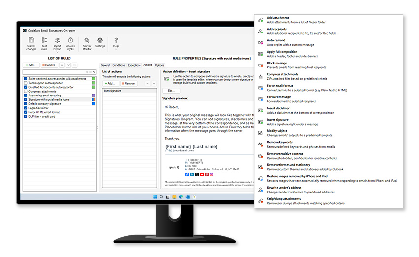 该程序不仅赋予您对企业邮箱签名的绝对集中管控权,更支持在数分钟内设计个性化签名模板——可嵌入图片(横幅、用户照片等)、自定义Active Directory属性、追踪链接、客户满意度调查等元素。结合复杂规则与条件设置,CodeTwo Email Signatures On-prem 提供的邮件流管理功能超越了Exchange原生邮件规则的实现,且操作更为简便。