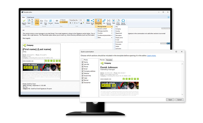 CodeTwo Email Signatures On-prem内置的模板编辑器将极大简化企业电子邮件签名的创建流程。该编辑器专注于简化签名部署,因此内置数十种预定义模板供您使用,您亦可根据自身需求对模板进行自定义设置。每款模板均由我们的HTML专家精心设计,并针对桌面端与移动端邮件客户端进行了优化。