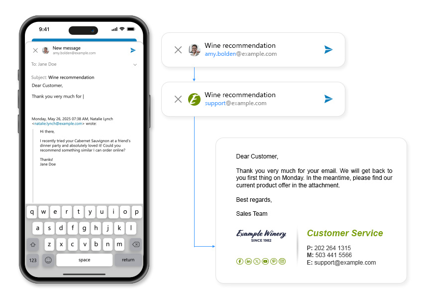 企业通常会设置通用邮箱地址供外部用户联系,例如 info@example.com。部门同样适用此规则。诸如 sales@example.com 和 support@example.com 之类的地址被广泛使用,使客户无需知晓具体员工邮箱即可联系组织内特定部门。然而,当市场部员工回复发往sales@example.com的邮件时,回复中该通用地址会被替换为其个人邮箱。这导致后续所有回复都将发送到完全不同的邮箱。