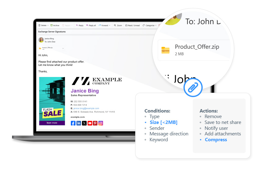 尽管Exchange Server内置邮件流规则(传输规则)具备部分功能,但这些规则缺乏全面控制邮件附件的必要特性。仅依靠邮件流规则无法实现附件的删除、压缩或归档操作,也无法配置自动添加文件至邮件的功能——该功能对销售团队的自动回复或常规营销通信尤为实用。