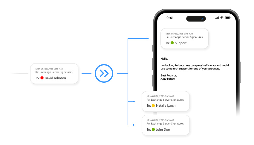而CodeTwo Email Signatures On-prem作为多功能Exchange邮件签名管理器,可让您全面掌控每封邮件。该程序支持基于多种条件和例外情况轻松设置转发规则。可实现的功能包括:转发特定用户的全部通信记录或仅转发选定邮件;创建内容检查策略,将可疑邮件重定向至指定人员或邮箱;将邮件转发至Active Directory用户及外部邮箱地址等。