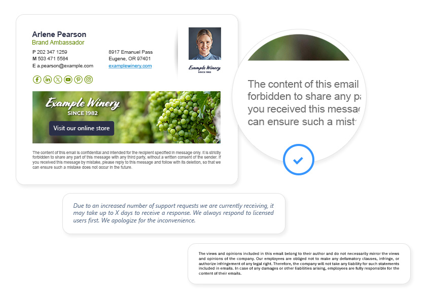 企业可借助CodeTwo Email Signatures On-prem,在Exchange本地环境或Microsoft 365混合部署中,为内部及外发邮件实施任意数量与类型的邮件免责声明策略。典型应用场景包括: