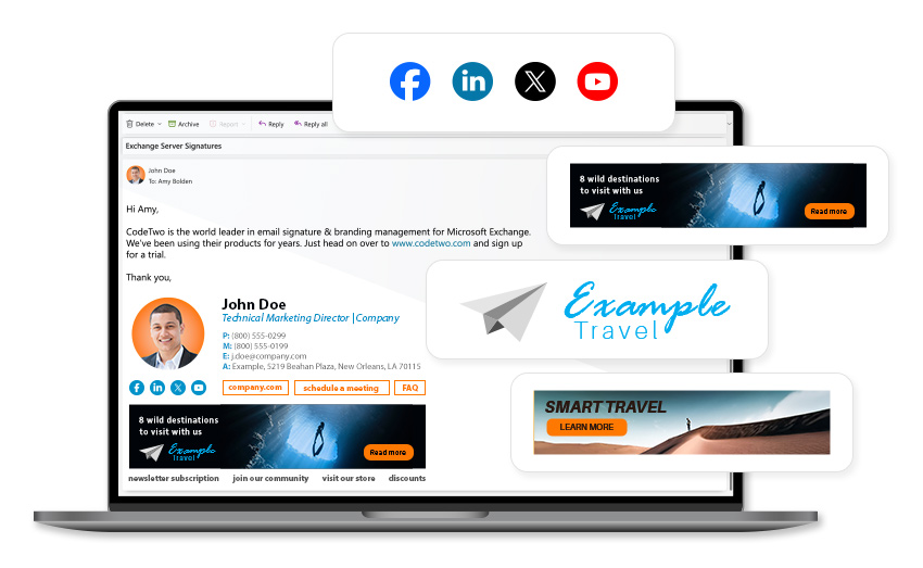 CodeTwo Email Signatures On-prem可自动为每封发送邮件添加营销横幅及其他元素。由此,您无需错失任何宝贵的营销契机,每封邮件都将成为推广优质服务的额外渠道。