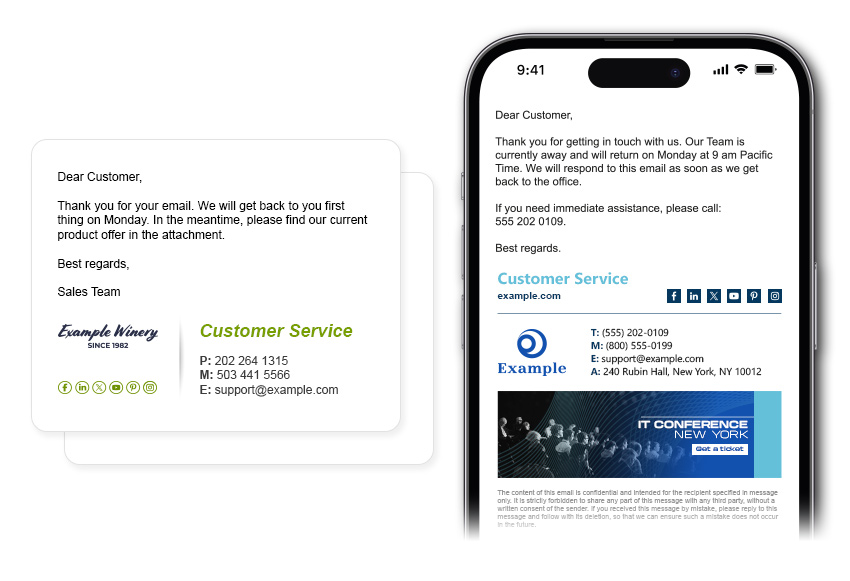 CodeTwo Email Signatures On-prem 突破了这些限制,提供可完全自定义且集中管理的自动回复功能,适用于多种场景。例如:销售团队自动回复、客户支持通知、无效邮箱地址告知等。此外,您的自动回复(包括外出通知)可呈现为普通邮件样式——支持包含图片、原始邮件内容、电子签名,甚至附件。