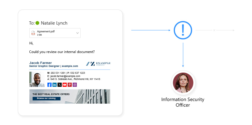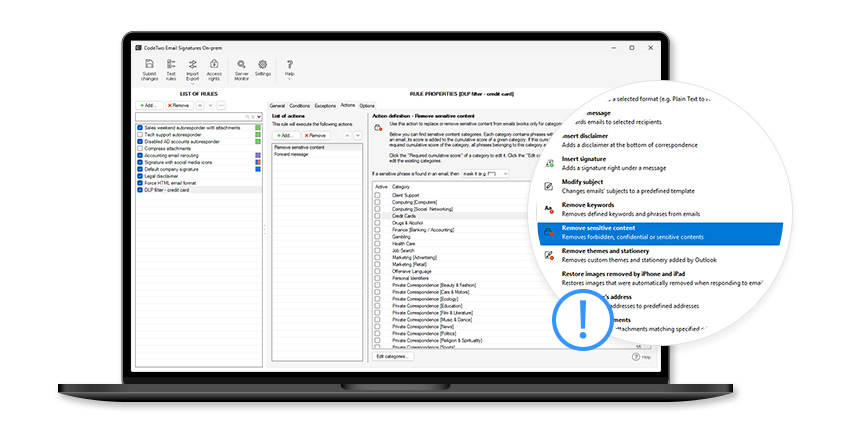 借助 CodeTwo Email Signatures On-prem,您可全面掌控所有外发邮件的内容。该程序支持应用自动邮件规则,拦截包含敏感数据、冒犯性语言等绝不应流出公司范围的信息。所有可疑邮件均可转发至信息安全官或指定邮箱进行审核。您还可设置自动通知机制,例如向数据泄露防范负责人或违反数据保护政策的用户发送警示。这些功能将助力您符合各类隐私法规要求。