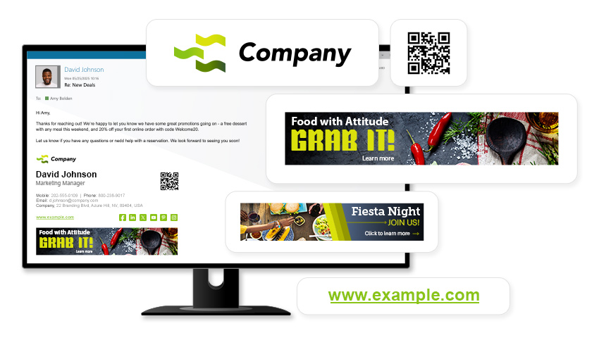 在自动签名中嵌入徽标、邮件横幅及社交媒体图标。
