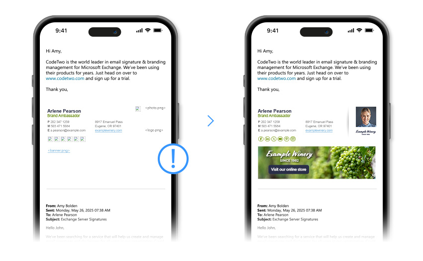 当您在CodeTwo Email Signatures On-prem中启用“恢复iPhone/iPad删除图片”功能后,所有图片将自动复原。此举既能确保邮件往来流畅可查,又能维持邮件的品牌标识与专业设计。该功能同时适用于收发邮件,无论贵公司或客户使用iPhone收发邮件,都能轻松应对。