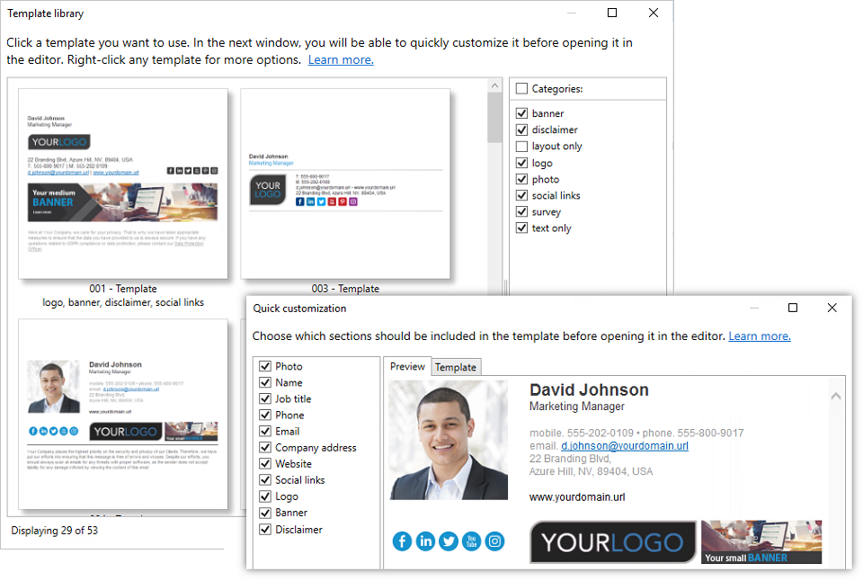 在模板库中快速定制预设签名、免责声明或自动回复模板,随后在编辑器中打开。例如可自由增删徽标、横幅、社交链接等元素。