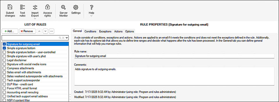 CodeTwo Email Signatures On-prem 允许您根据预设规则管理 Exchange 服务器上的邮件流。其功能涵盖多个方面,包括邮件内容控制、附件过滤、消息重定向、电子邮件签名、免责声明等。条件与操作的组合方式几乎无穷无尽。