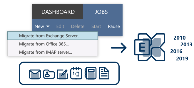 CodeTwo Exchange Migration 允许您将用户邮箱和公共文件夹的内容从一台本地 Exchange 服务器迁移到另一台。该程序支持从 Exchange 2010 及以上所有版本的 Exchange 服务器进行迁移。作为迁移的目标环境,您可以选择 Exchange 2010、2013、2016 或 2019。