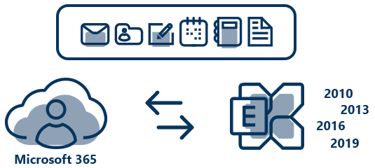 CodeTwo Exchange Migration支持从Office 365(Microsoft 365)直接迁移至Exchange 2010及更高版本,包括最新版本Exchange 2019。您无需耗时处理PST导出/导入任务,也无需构建复杂的混合环境即可将组织迁出Office 365租户。若源邮箱启用了归档功能,您可轻松将主邮箱和归档邮箱同步迁移至本地Exchange服务器。