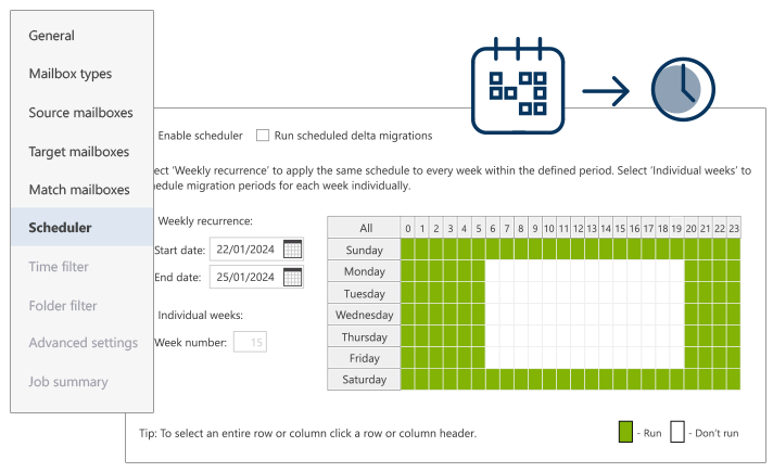 CodeTwo Exchange Migration具备高级配置功能,可实现:仅迁移特定时限内的项目(如近一两年邮件)、排除“已删除邮件”或“垃圾邮件”等邮箱文件夹。您还可利用内置计划程序,设置在特定时间段自动启动/停止迁移进程。