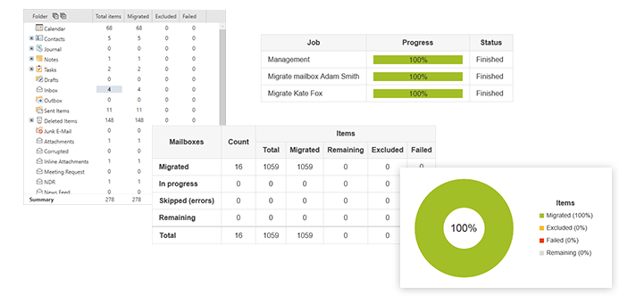 CodeTwo Exchange Migration会全程追踪迁移过程,并将结果反馈给您。您可以为单个任务、选定邮箱或所有已配置的迁移任务生成包含可靠统计数据的详细报告。您还可随时在程序仪表板中查看实时统计数据,监控正在进行的迁移进程。