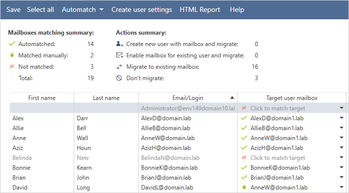 使用CodeTwo迁移工具时,您可以选择手动或自动匹配源邮箱与目标邮箱。当面临大规模迁移任务时,后者尤为实用——手动匹配简直是种折磨。