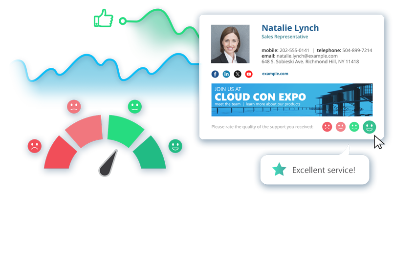 借助CodeTwo云服务,您可直接从邮件及签名中收集反馈。反馈收集自动化轻松实现:为销售、客户成功及服务台团队插入不同CSAT调查,根据关键词或邮件发送目的地动态调整调查内容,功能远不止于此!