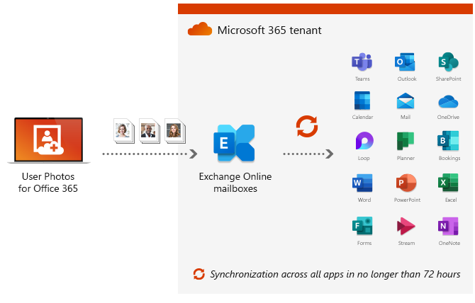 本应用自动处理照片尺寸调整,将多张照片与对应用户账户匹配,并直接上传至用户在Exchange Online的邮箱。照片将自动同步至SharePoint Online和本地环境、Outlook网页版(含日历、联系人及群组)、Outlook客户端、Microsoft Teams、Microsoft Viva、Stream、Planner、OneDrive、Microsoft 365群组以及整个Microsoft 365环境的个人资料卡片。