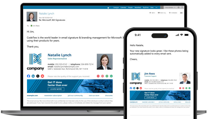 当邮件满足您在CodeTwo Email Signatures 365中设定的条件时,应用程序会自动将发件人的Microsoft 365信息及照片填入占位符,并将签名添加至邮件中。